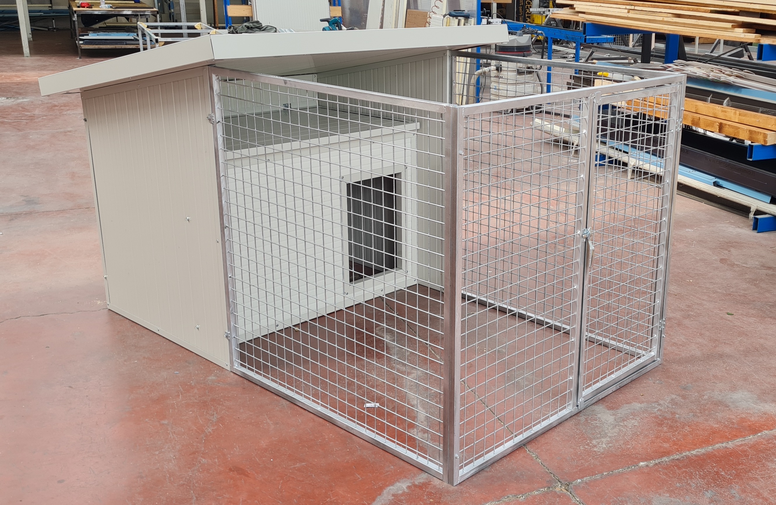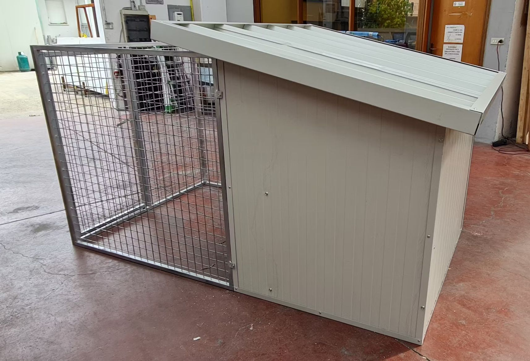 Box Cuccia 2x2 mt realizzato con pannello in coibentato 30 mm di spessore, rifinito perimetralmente con lamiera pre verniciata bianco/grigia RAL 9002, 12 decimi di spessore, telaio in ferro nella parte anteriore formato da tubolari zincati 25x25x2mm, avente porta di misure 180x70 cm incernierata con perni sfilabili e chiusura con catenaccio lucchettabile zincato, il tutto chiuso con rete elettro saldata 50x50 filo 4 mm. Tetto a totale copertura con pannello pentagrecato da 80 mm rifinito perimetralmente con lamiera pre verniciata Bianco\Grigia RAL 9002.