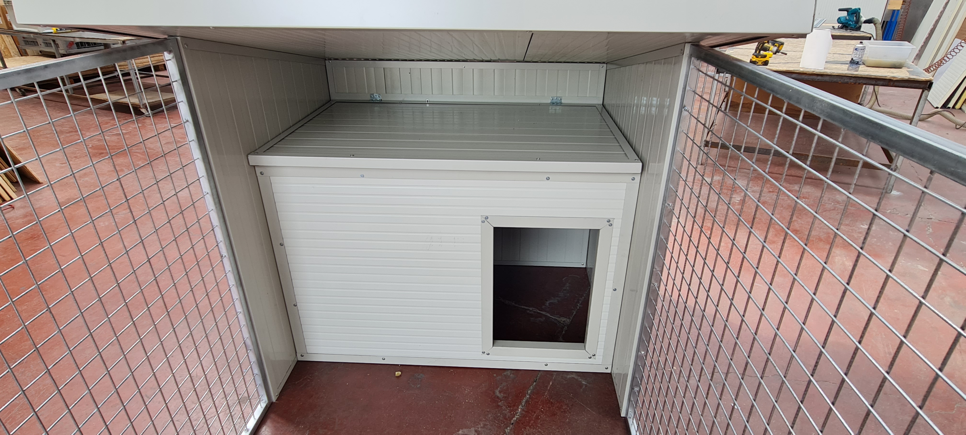 Box Confort di misure 3x2 mt realizzato in pannello coibentato, diviso in zona notte e zona giorno.La zona notte di misure 2x1 mt è realizzata con pannelli coibentati 30 mm di spessore, rifiniti perimetralmente con profili in lamiera pre verniciata RAL 9002 Bianco|Grigia , nella parte frontale troviamo numero 1 porta in coibentato e numero 1 gattaiola di misure 60x40 cm con sistema di scorrimento a ghigliottina, mediante guide in lamiera pre verniciata e pannello in lamiera piegata anti taglio.